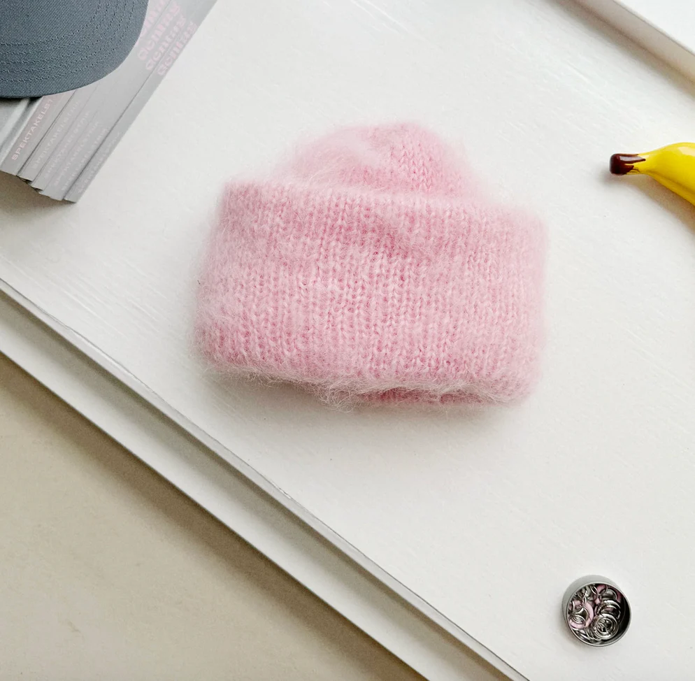 Die Fat Fur Hat wird als langer, geschlossener Schlauch mit Abnahmen an beiden Enden gestrickt. Die Mütze wird dann in sich selbst gefaltet und aufgerollt. Die Mütze wird dreifädig aus einem Seide-Mohairgarn gestrickt, das anschließend mit einer Mohairbürste aufgebürstet werden kann, damit es noch flauschiger wird.
