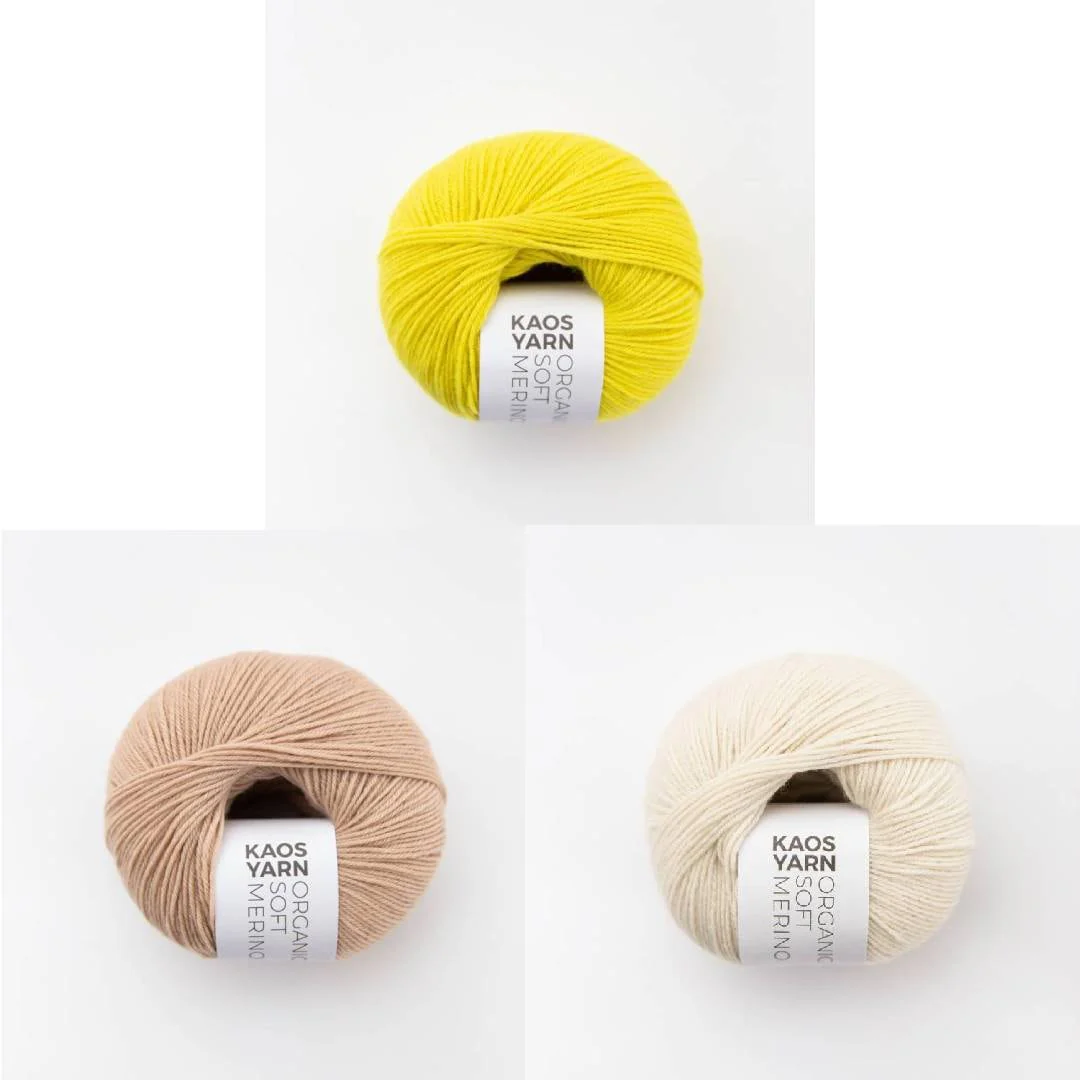 - 4 Knäuel Merino von Kaos Yarn (50g) in 3 verschiedenen Farben